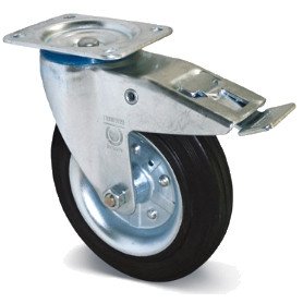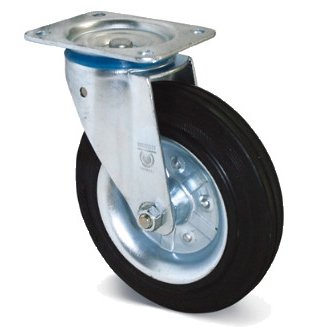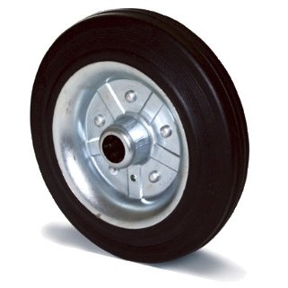Колесо из стандартной литой резины чёрного цвета, твёрдость. Диск изготовлен прессованием из листовой стали, скреплён высокопрочными стальными заклепками, имеет рёбра жёсткости, с трубчатой стальной ступицей, на роликовом подшипнике, поверхность деталей оцинкована и подвергнута пассивации. Производство Германия.